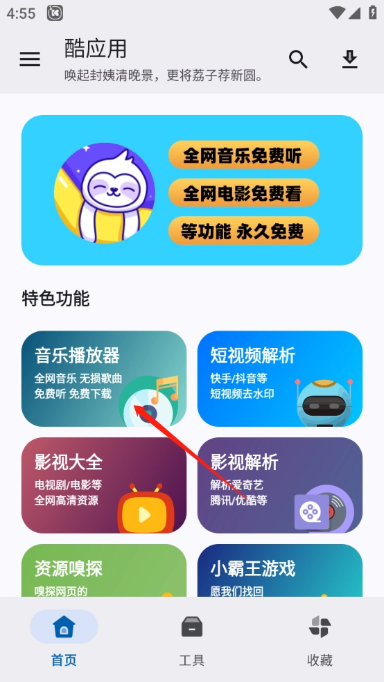 首页页面推荐了当下热门的工具资源,涵盖音乐播放器、短视频解析、影视大全等。