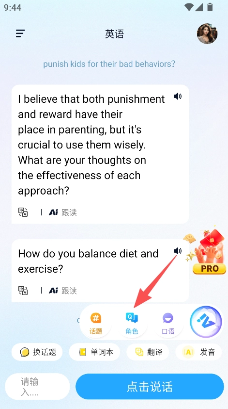 2、设置角色选择功能,提供多种身份选项,以适配不同场景下的英语交流练习需求。