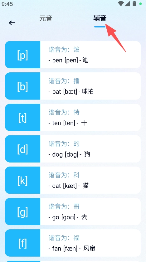 3、拥有音标学习功能,进入音标板块后,能够查看元音和辅音的谐音以及例词信息。