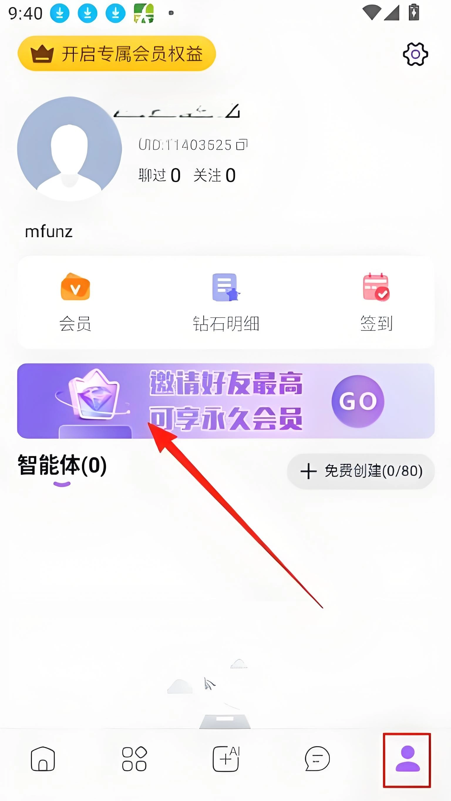 2、随后我们会顺利进入个人中心页面,找到位于中间位置的“邀请好友最高可享永久会员”选项。