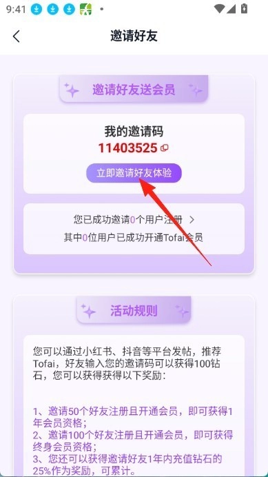 2、成功邀请100位好友完成注册并开通会员,即可获得终身会员资格。