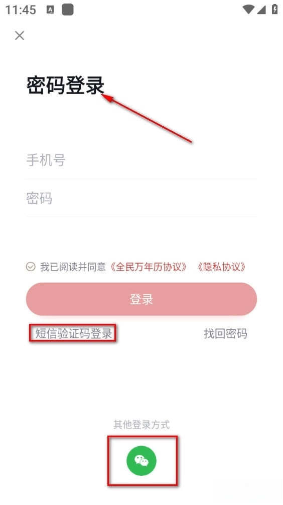3、可以选择密码登录、微信登录或验证码登录