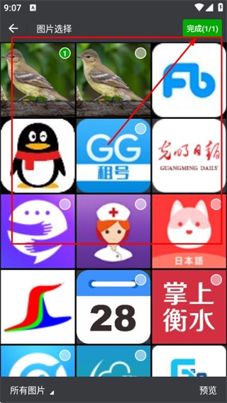 3、在图片选择界面选中目标图片后,点击右上角的完成按钮,即可进入图片转PDF界面。