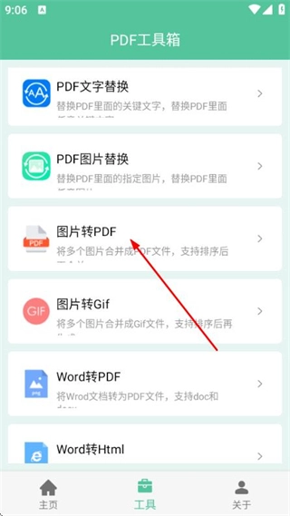 2、在PDF工具箱页面找到并点击“图片转PDF”选项,即可进入图片选择页面。