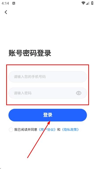 3、进入账号密码登录界面后,输入手机号与密码,勾选相关协议,随后点击登录按钮,即可完成账号登录流程。