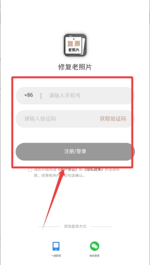 2、先输入手机号,点击“获取验证码”,再点击“注册登录”按钮。