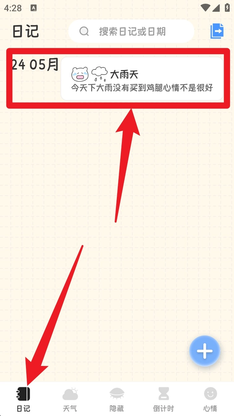 5、回到首页就能看到刚写完的日记条目,里面有标题、内容、天气和心情表情,一眼就能回顾当天的状态。