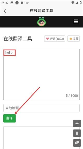 3、在输入框中填写需要翻译的文字(例如【hello】),确认内容无误后点击【翻译】按钮来进行翻译操作。