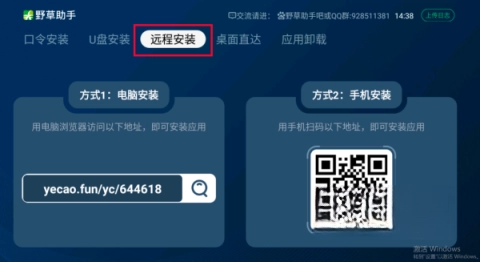 4、若系统完全禁止第三方应用安装且无法开启相关选项(例如部分长虹、TCL、创维型号),此时只能通过U盘使用系统自带的安装功能。插入U盘后,野草助手会将用于输入口令的应用传输到U盘中,之后再手动进行安装。