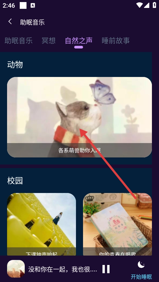 2、进入助眠音乐分类页面后,找到“自然之声”分类,从中选择“动物”类内容,即可进入对应的歌单页面。
