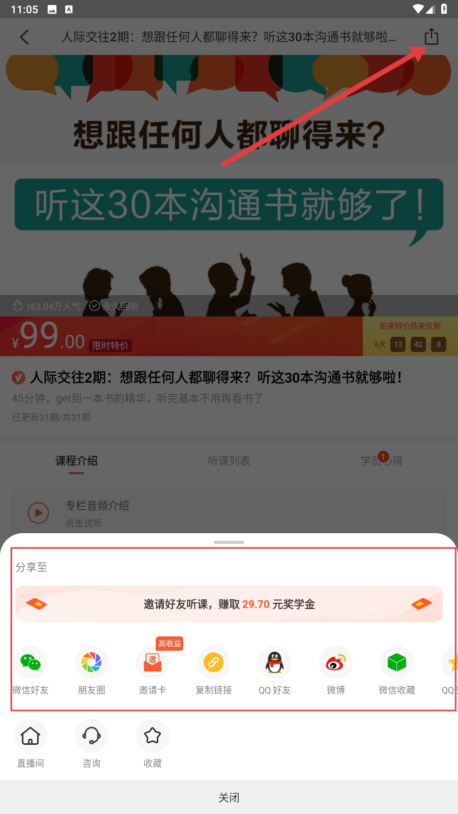 3、进入课程详情页面后,点击分享图标,从微信、朋友圈等渠道中选择一个来分享该课程。