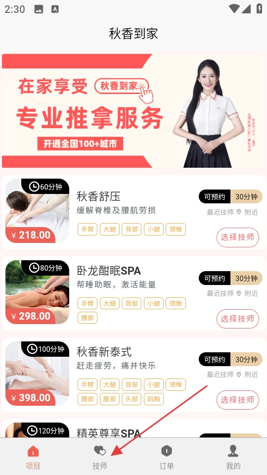 1、在【秋香到家】项目页面,点击底部的【技师】选项,即可进入技师列表页面。