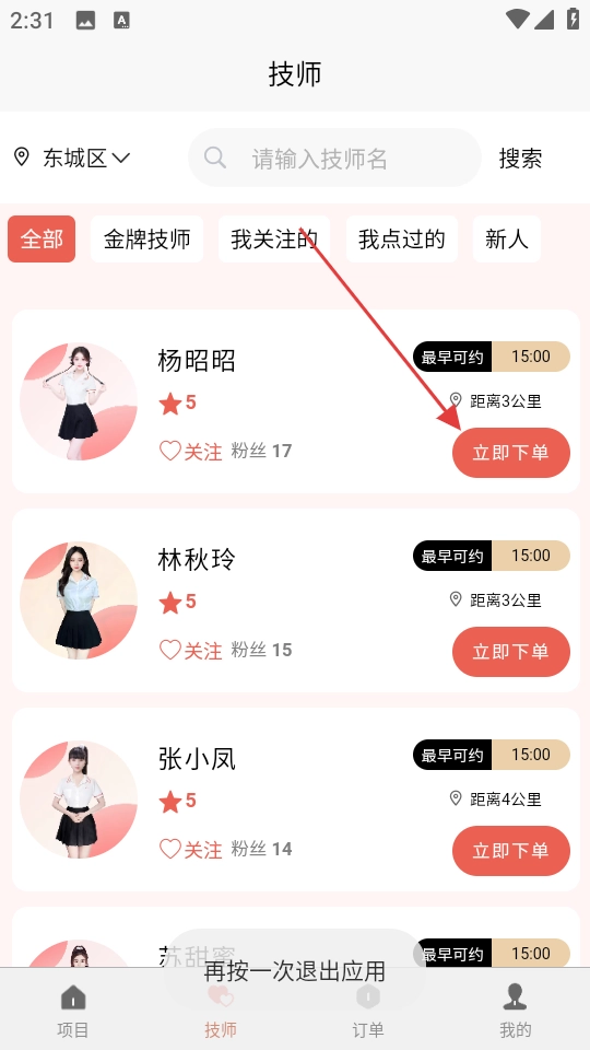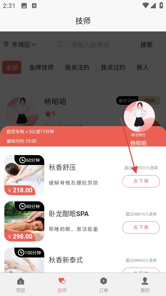 2、在技师列表页面,选定技师后点击【立即下单】按钮,即可进入技师服务项目的选择页面。