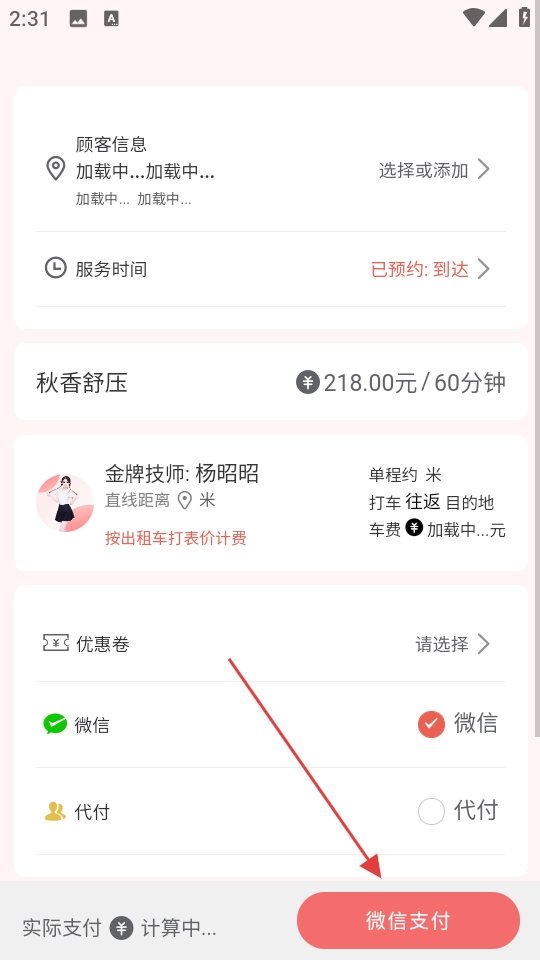 4、进入订单详情页面后,先核对好相关信息,接着点击【微信支付】按钮,以此完成推拿服务订单的支付流程。