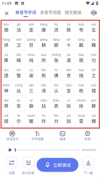 3、进入组卷练习页后,可切换【单音节字词】等模块,借助拼音显示、语速调整功能,点击【立即测试】启动该模块练习。