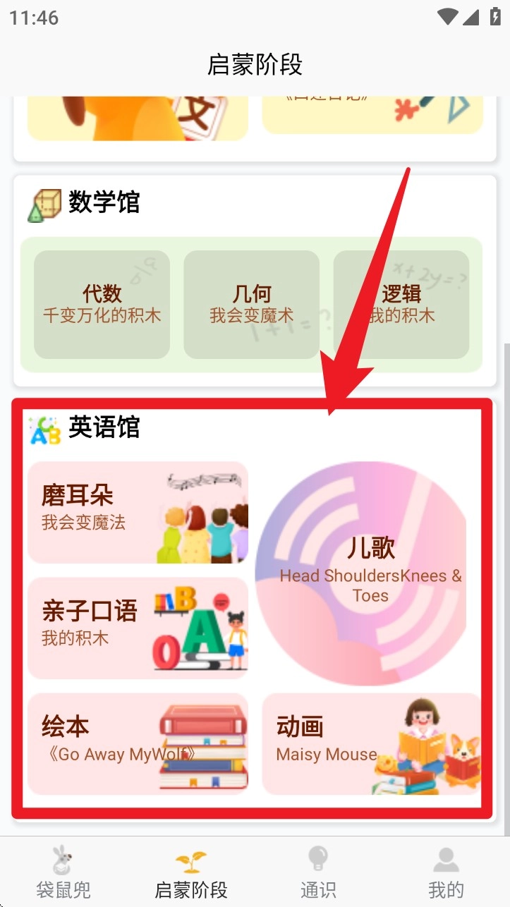 3. 在启蒙阶段中,可选择语文馆、数学馆、英语馆任一板块,浏览听说读写等内容。