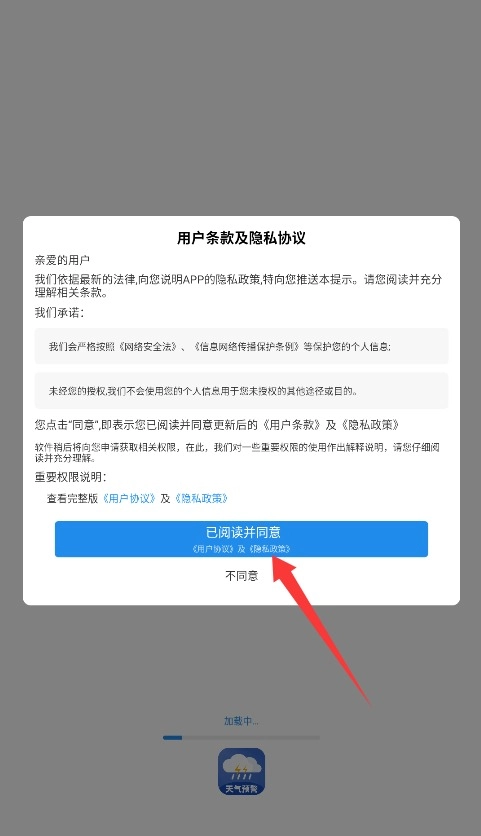 1、启动之后,仔细阅读用户协议与隐私条款后,点击已阅读并同意进入主页面。