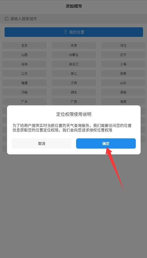 2、开启定位功能自动获取位置,或手动输入需要查询的城市名称完成地址设置。
