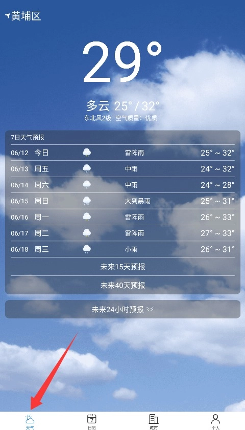 3、进入气象预报界面,即可查看当地实时天气状况和未来几天的气候变化趋势。