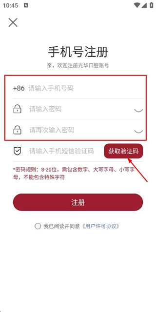 2、在注册账号页面填写手机号码、密码后,点击获取验证码。