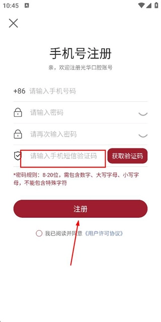 3、在注册账号页面填写验证码,勾选协议后点击注册完成注册操作。
