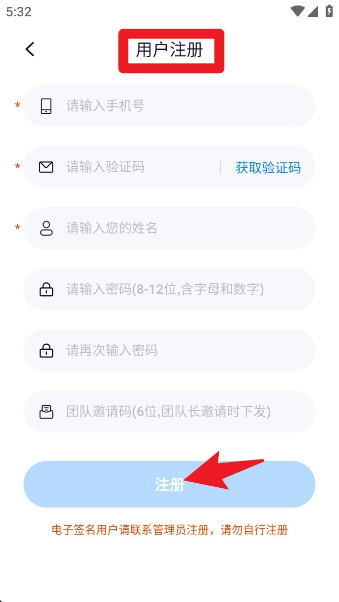 1. 打开App后点击快速注册,依次填写手机号、验证码、姓名和密码,最后输入团队邀请码并点击注册,即可完成账号申请。