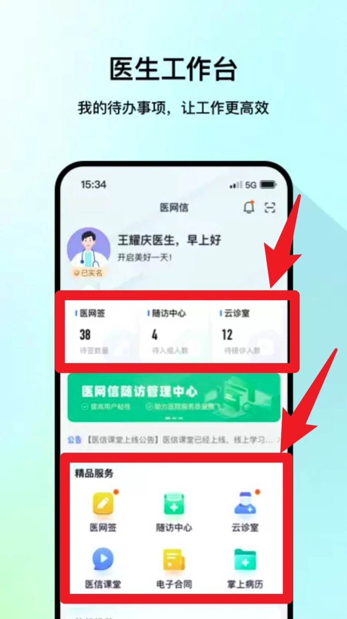 3. 进入首页后会看到医生工作台,可快速查看待签病历、随访人数及待接诊数,一目了然,工作安排更高效。