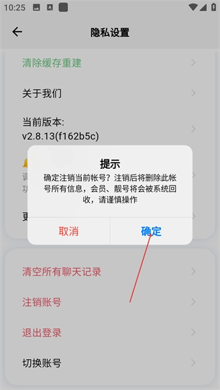4、在注销提示弹窗中,确认信息后点击【确定】按钮,完成账号注销操作(注:操作后账号信息将被清除)。