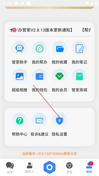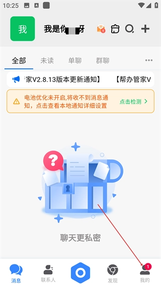 1、在消息页面点击底部【我的】选项,进入个人中心界面,可查看各类功能入口。