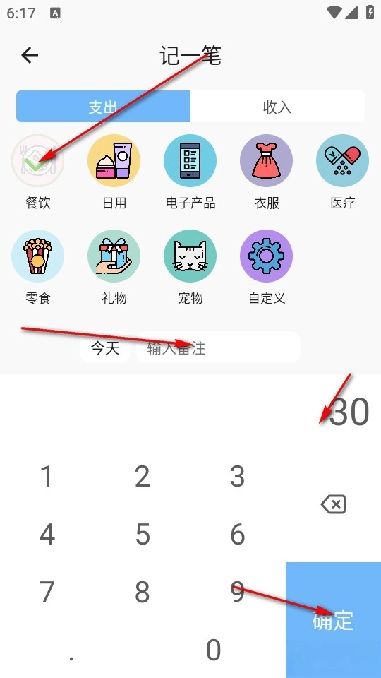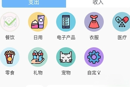选择你的花销或者收入,选择消费图标,输入金额后点击确定即可。