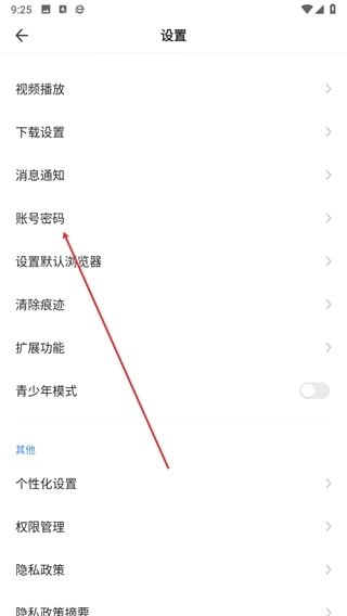 3、在设置界面的选项列表里,找到账号密码选项并点击进入对应页面。