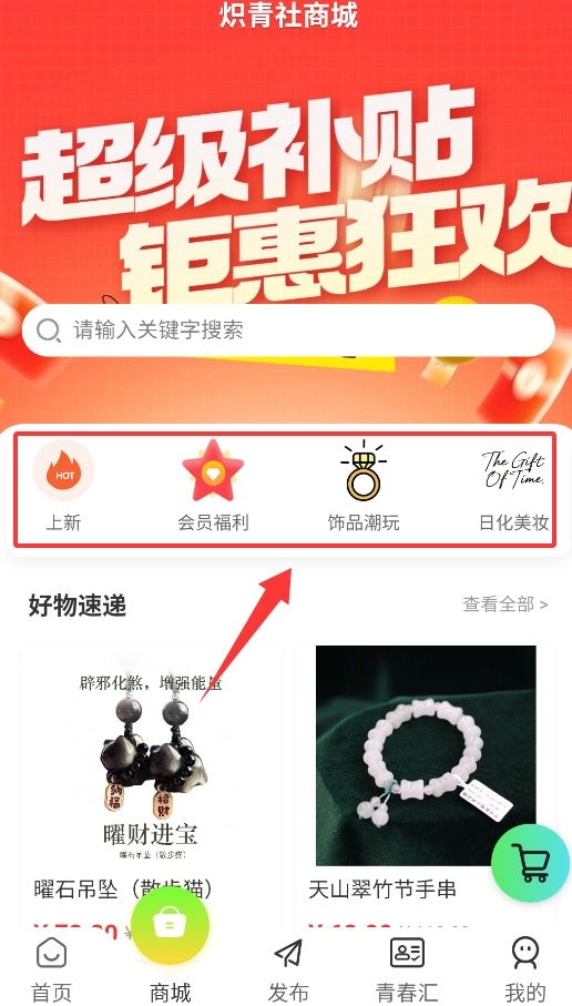 3、商城界面展示上新商品、会员福利、饰品潮玩、日化美妆等商品分类。