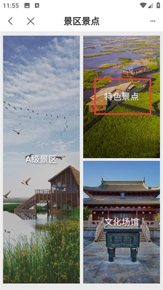 3、在【景区景点】页面,选择【特色景点】分类,可查看该类别下的各类景点内容。