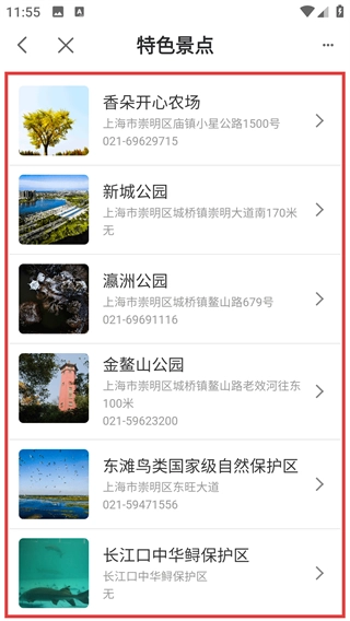 4、进入【特色景点】页面,能看到【香朵开心农场】等景点的列表,里面包含地址、电话等信息,便于大家了解景点的详细情况。