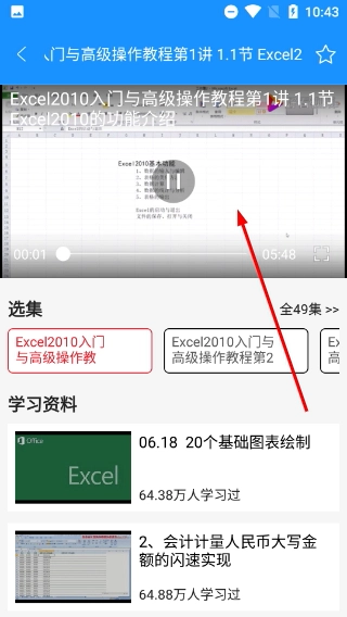 4、在视频播放界面,可通过播放控制区域操作视频进度,同时可在选集栏切换不同课程章节,系统学习【Excel】相关知识。