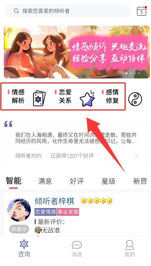 2、咨询板块提供情感分析、恋爱关系、感情修复等专业咨询服务入口。