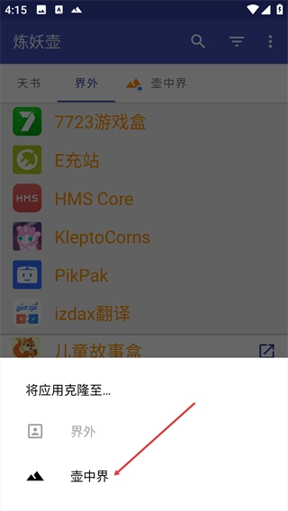 4、弹出【将应用克隆至...】选项,选择克隆到【壶中界】,完成应用的克隆操作。