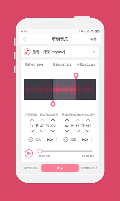 2.剪切与裁剪:确定音乐需剪切的起始点和终止点后,点击“保存”按钮就能完成剪切操作。