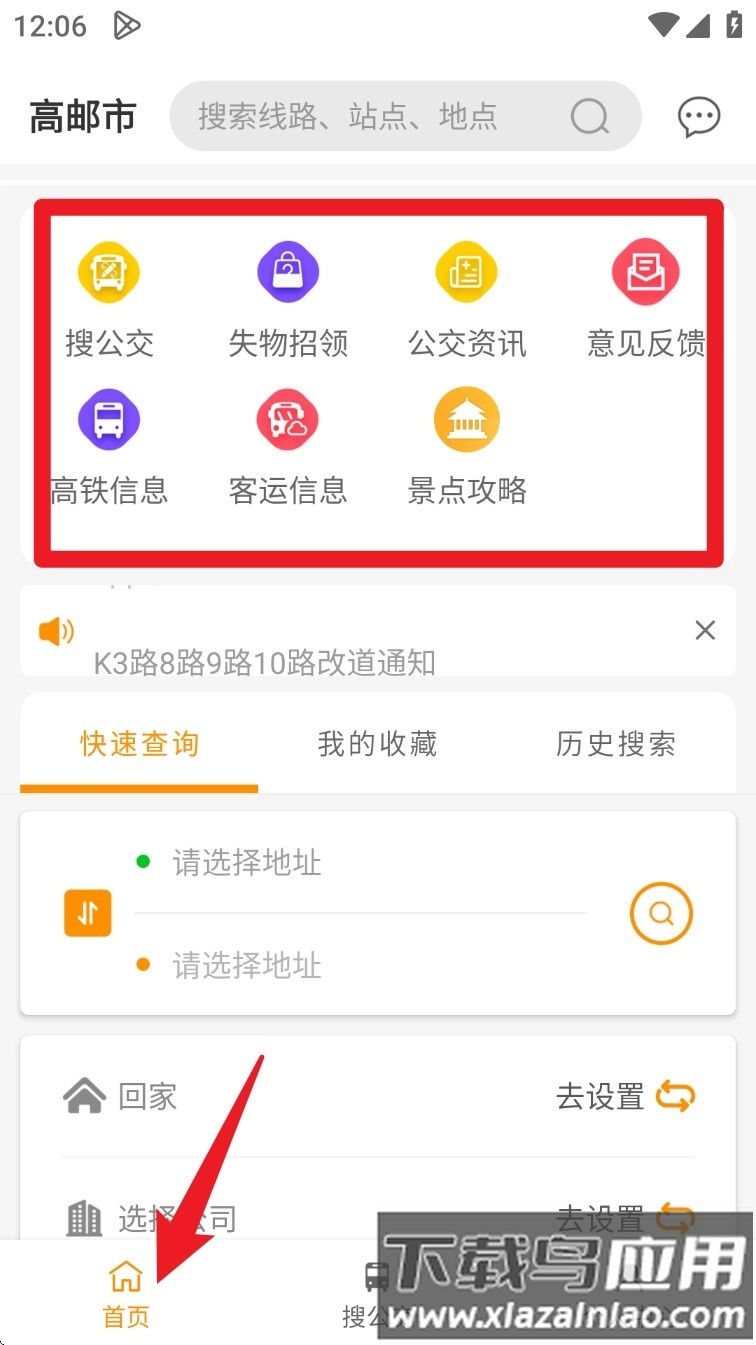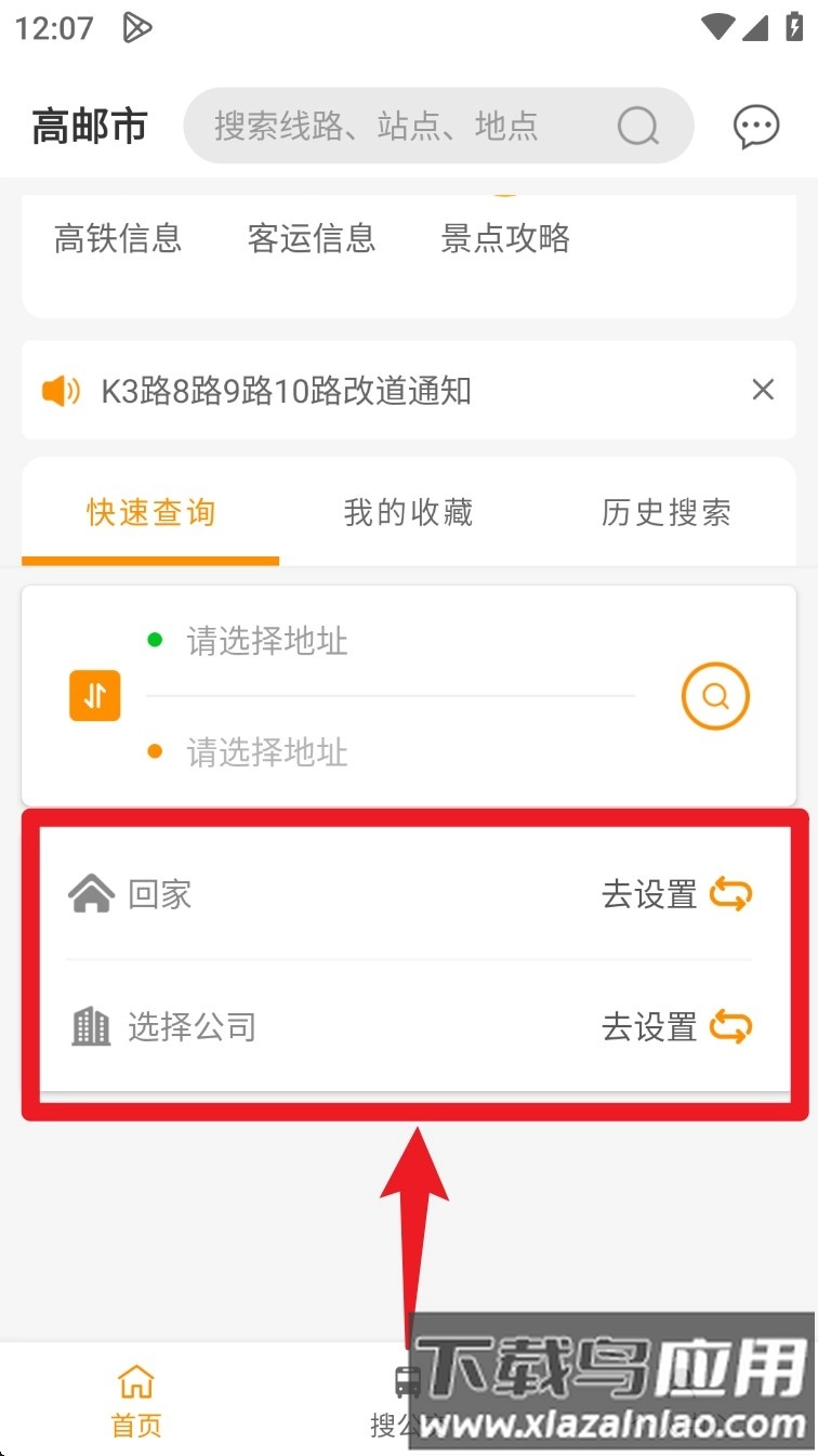 4. 回到首页后,在“快速查询”功能里添加家庭、公司等常用地址,这样能让日常导航更便捷;