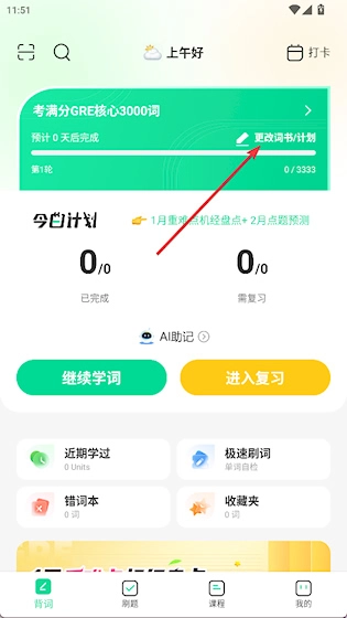5、学习数据追踪 自动记录每日学习动态,包括新增词汇、易错词汇和收藏内容,生成可视化数据记录,方便复盘与调整学习策略。1、在背词界面点击更词书/计划