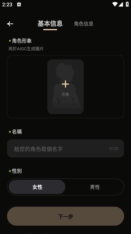 3、进入“创建独特的角色”板块,对角色的性别、外观、性格、背景等信息进行设置,完成设定后,就能和自己创建的角色展开互动。