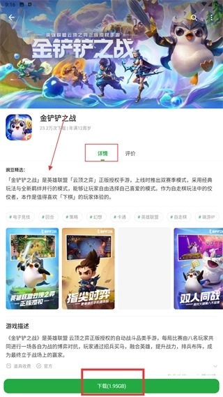 4、在【金铲铲之战】详情页,点击底部【(1.95GB)】按钮,即可开始这款自走棋。