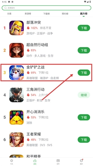 3、在飙升榜列表里,找到像【金铲铲之战】这样的条目,点击对应的区域,就能进入该游戏的详情页面。