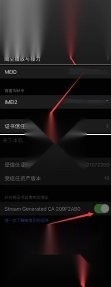 在手机上完成相关程序的部署操作后,接下来需要进入系统的设置界面,依次找到通用设置、设备信息相关的选项,再进入证书管理的子菜单,在其中定位到需要配置的证书条目,并启用信任权限。