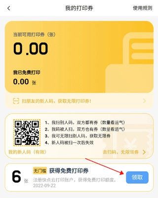 点击【我的打印券】,首次注册的新用户点击【领取】按钮就能获取免费打印券。
