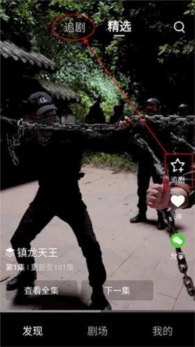 用户打开天天看剧软件后会进入发现页面,在该页面可观看短剧。若遇到喜欢的短剧,点击右侧星星即可收藏,后续能在左上角的追剧页面查看已收藏的短剧。
