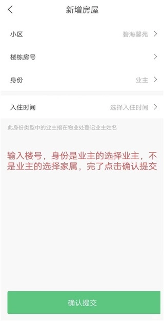 请正确填写楼号与房间号,再进行身份选择:若是业主请选“业主”,若非业主则选“家属”。信息填写正确后点击提交即可。若提交者为业主,物业将在核实信息后点击通过。
