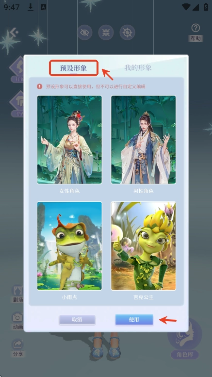 用户们进入角色定制页面,先点击角色库
