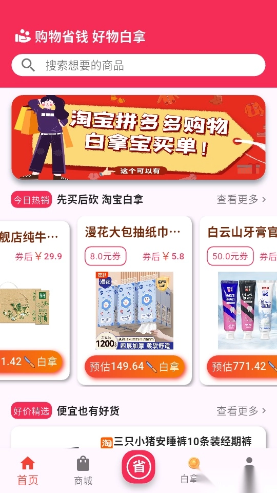帮用户在下单购买所需商品好物时省钱,降低更多购物成本,让你能省钱下单。