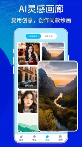 1、软件内设有AI灵感画廊,你可以在这里复用创意,根据已有提示词生成同风格的绘画作品。